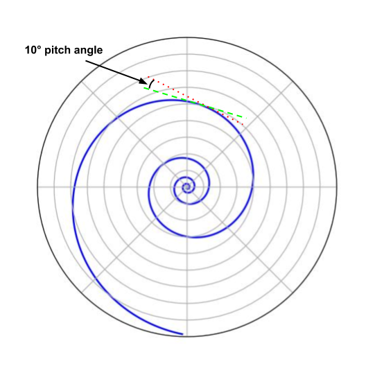 The pitch angle of a spiral arm is the angle between a line tangent to a spiral arm at a given radius (red dotted line) and a line tangent to a circle of the same radius (green dashed line). A small pitch angle means the arm is tightly wrapped and approaching circular winding (0° is a circle). A large pitch angle means the arm is more open and approaching a ray whose origin is the center of the galaxy (90° is a ray).