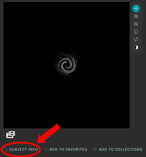 You can find a galaxy's metadata by clicking the SUBJECT INFO link at the bottom left corner of the viewer (see the image below). The metadata for each galaxy includes the Cluster Buster filenames, aggregated information found on HyperLeda, information found on SDSS, the number of clusters in the image, and a sky survey image from the DESI Legacy Imaging Surveys.
