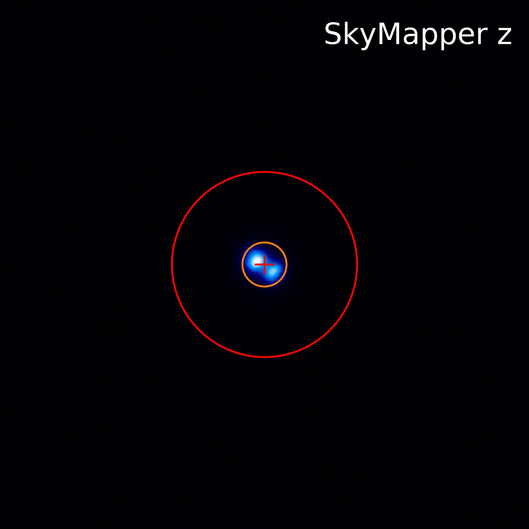 In some cases, an object can appear "not round" because the image reveals two stars that are close enough together that their light is blending in the image. Consider this image from DD2.0. You can see that it has two points that are blending together a bit in the middle. If you see this in PanSTARRS or Skymapper data, and the brightest parts of the two objects are both within the inner circle, you should select "Multiple objects in the inner circle."