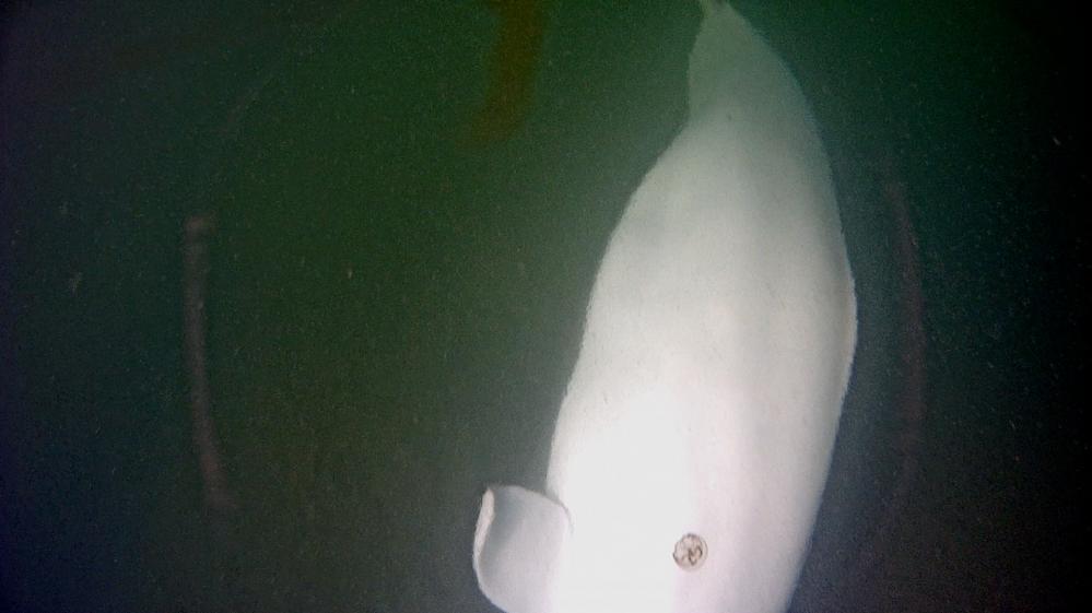 Pectoral fin shape can be used as a secondary means to determine age, especially if lighting conditions make judging colour difficult. Adult male beluga in this population develop upward-curving tips on their pectoral fins. In some pictures this upward curl can be very pronounced in adults, as in the example shown here.