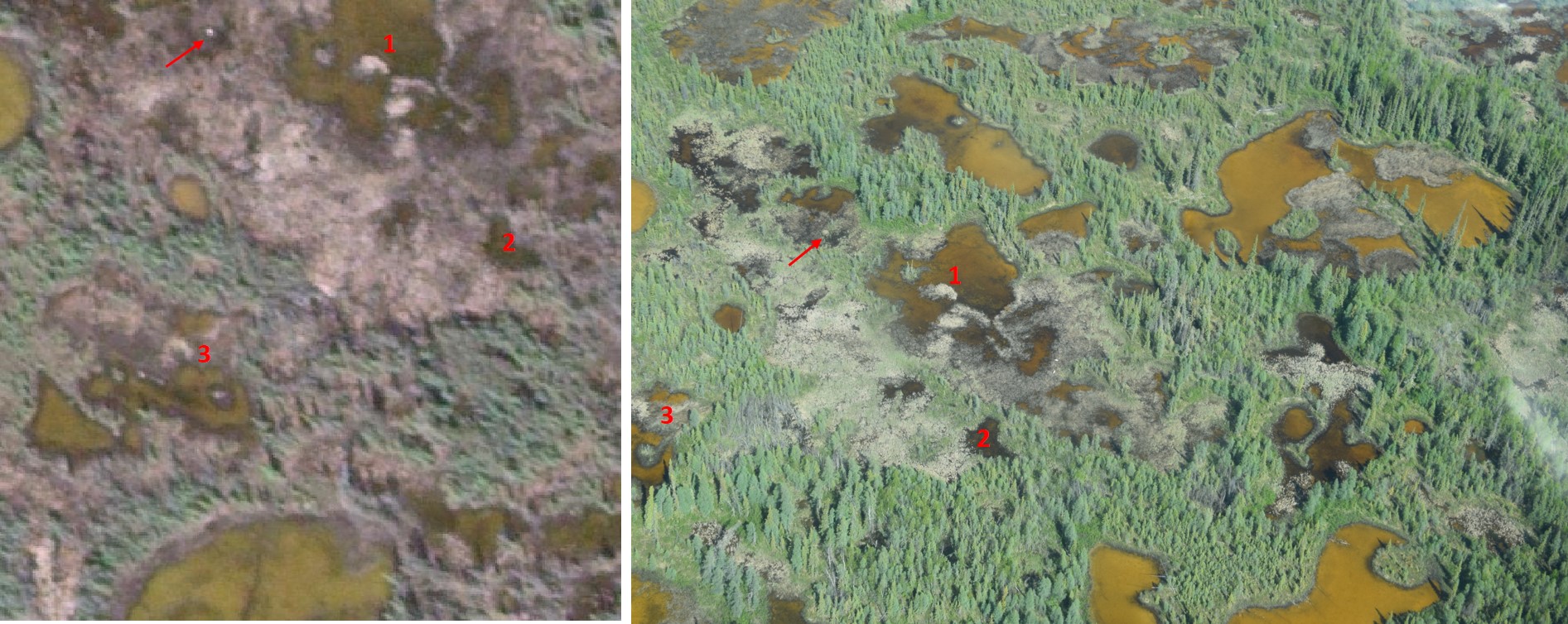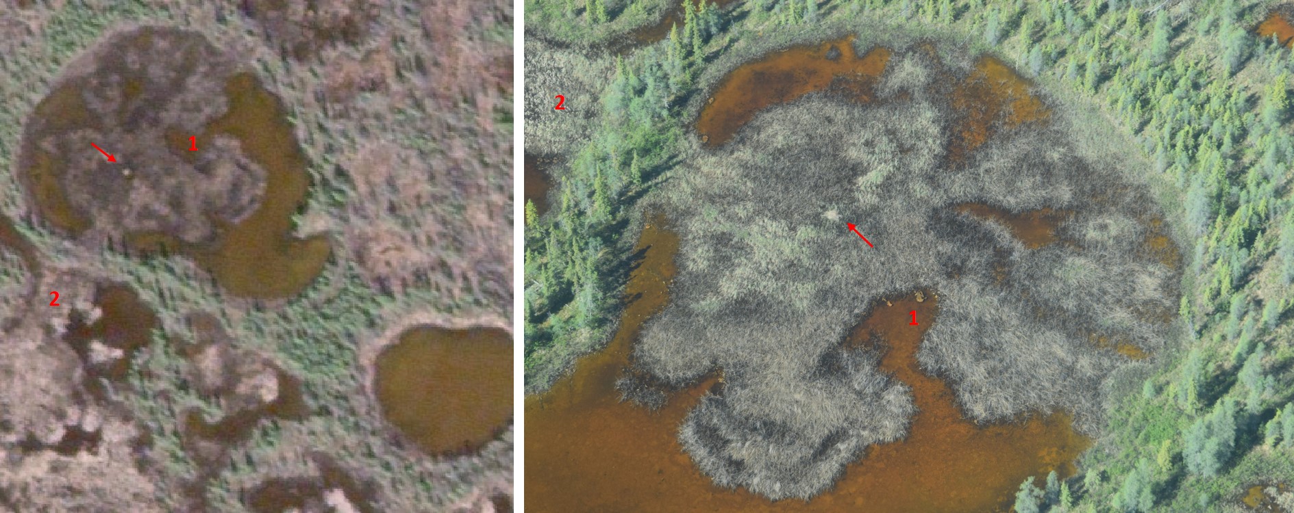 The red arrows are pointing towards the nest, and the numbers are highlighting different features, for your reference. Since these aerial checks occurred more a few weeks after the satellite image was taken, the cranes were not necessarily sitting on the nest as consistently when the aerial photos were taken.